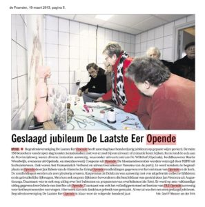Opende Uitvaartvereniging De Laatste Eer uit Opende bestaat honderd jaar. Komende zaterdag -16maart – wordt er stilgestaan bij deze mijlpaal. In en rond de aula van De Laatste Eer Opende -afgekort Dle Opende…
